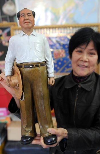 江西省定南縣縣城居民劉仲文和黃瑛夫婦從1966年開始收集毛澤東像章,40余年來踏遍全國各地,先后收集到1.7萬個品種、3.3萬枚毛澤東像章,這些像章由金、銀、銅、鐵、水晶、玉、竹木、陶瓷、刺繡、不銹鋼及有機玻璃等不同材質制成,最大的直徑達20多厘米,最小的直徑不到1厘米,圖案五光十色,形狀千姿百態,其中不少像章已十分罕見。他們將毛澤東像章按制作年代進行分類,使之成為系列專題,并制成畫框,擺放成天安門、東方龍、萬里長城、紅日出韶山、慶祝澳門回歸、井岡山等圖案。 圖為黃瑛在展示收藏的毛澤東瓷像。