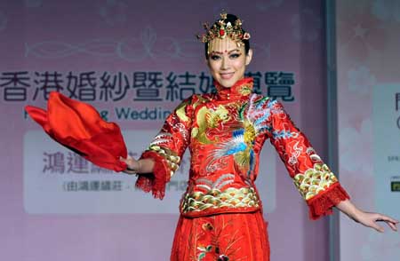 “香港婚紗暨結婚博覽2010”日前舉行,各參展商家使出渾身解數大力宣傳,力求取得最佳經濟效益。圖為模特在展會上為一家婚禮用品商家走秀。