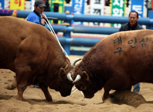 56歲農民河石口,輕輕撫摸著剛從賽場上得勝歸來的公!昂I”的頭,神情有幾分心疼,亦有幾分自豪。 “上場前我跟它說:‘你好好比吧!’沒想到,它真的那么聽話!6歲的“海濱”在日前開幕的韓國清道斗牛節中首次亮相就表現出色?鄳鹬,“海濱”疲憊得直喘粗氣,頭上被對手的犄角頂出一道血紅的傷口。 在不遠處的圓形綜合斗牛競技場內,一年一度的清道斗牛節賽事正酣。在柵欄圍起的沙地上,在牛主人“上!上!”“頂它!頂它!”的呼喊聲中,兩頭公牛你攻我守、時退時進,觀眾發出陣陣喝彩聲。 每年3月,慶尚北道的清道郡就成了斗牛愛好者云集的地方。今年共有132頭牛受邀前來一決高下,它們過去兩年間都曾在各地賽事上進入前8名。今年清道斗牛節獎金總額高達1.51億韓元(1美元約合1134韓元),冠軍牛的主人將得到600萬韓元的獎勵。 與西班牙斗牛不同,韓式斗牛中,看不到披著紅斗篷的斗牛士,而是牛與牛相斗。如果有一方退縮放棄、掉頭跑掉,比賽便告結束。今年的斗牛比賽為期5天,按重量分6級進行,參賽牛通常都在5歲到7歲之間。 牛主人即教練,一般按照眼距短、前腿短、身子長、犄角粗短有力等標準挑選具有“斗牛潛質”的小公牛,不加閹割便進行登山路、拉輪胎等訓練。斗牛不下田、不干農活,而是一心備戰。 斗牛在飼養上也非常講究,通常吃大麥、豆子、面粉和草料混煮的飼料。在賽事臨近之時,有的牛主人會給斗牛喂食人參等補藥,或蛇、泥鰍、墨魚仔等高蛋白食物。因此,養殖斗牛開支巨大。擁有3頭斗牛的河石口告訴記者,每頭牛每年要花掉600萬韓元。如果在比賽中獲勝,牛的身價將高漲。一般參賽的斗牛價格大約在2000萬至3000萬韓元,而一旦奪冠,身價便可能上漲至一億韓元。 韓國的斗牛習俗可以追溯到農耕時代,起初是牧童閑來無事取樂解悶,后來發展成為部落或氏族顯示勢力的一種手段。在1910年至1945年日本占領朝鮮半島時期,斗牛比賽因易于聚集人群、鼓舞士氣而為當時的占領者所懼,被迫中止。直到上世紀70年代,斗牛比賽才又開始逐漸盛行。清道郡舉行成規模的賽事始于1990年,到1995年已經發展成“韓國之最”,1999年入選韓國文化觀光部指定的“韓國十大地區文化觀光慶典”。 近年,清道郡還投資640億韓元建成了韓國第一座室內斗牛競技場,可容納觀眾一萬多名。去年斗牛節期間,共吸引了國內外游客53萬人次,斗牛節成為當地發展旅游產業、推動經濟發展的一大支柱。 |