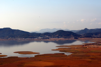 清晨,微曦初露。踏上蜿蜒伸展的“無霧橋”,便置身于一望無際的黃色蘆葦叢中。放眼望去,綿長的海岸線環抱著大片的灘涂和茂盛的蘆葦。四周一片靜謐,蘆葦叢中隱約可見羽毛灰黑、頸部雪白的珍稀鳥類白頭鶴,時而悠閑踱步,時而展翅高飛;遠處,鳥群不時騰空而起,變換著“一”字和“V”字形隊伍,翱翔盤旋! ∪绱藟艋冒愕膱鼍,在韓劇中經常出現。隨著“韓流”之風日盛,越來越多的中國游客來到韓國,試圖尋找這種美景。首都首爾、韓劇《冬日戀歌》、《大長今》的拍攝地南怡島、濟州島等地是大多數人的選擇。然而,當筆者來到位于朝鮮半島南端的順天,才驚覺,要感受韓國的天然美,不到順天實在是“遺珠之憾”。