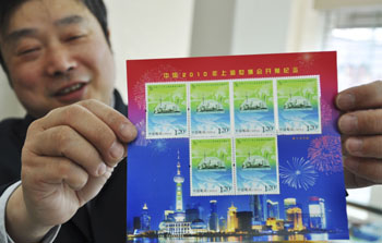 蘇州郵政局工作人員展示《中國2010年上海世博會開幕紀念》郵票的小本票。新華社發(朱桂根/攝) |