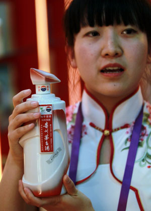 作為中國2010年上海世博會惟一指定白酒,國酒茅臺在世博園內推出根據各國家自建館的建筑風格設計的限量紀念版“世博喜酒”。新華社記者 任瓏/攝 |