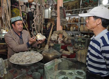 “你知道我的夢想是什么嗎,我想收集齊中國56個民族每個民族的特色藏品,讓我的民間博物館成為最豐富的民族收藏品展館!薄 ≌f這話的,是新疆喀什的一位維吾爾族民間收藏家艾尼·阿布拉。他的博物館位于當地最著名的老城高臺民居上,琳瑯滿目的各樣藏品讓進入其中的游客目不暇接。 一個春日的午后,記者信步走進迷宮般的喀什老城,七彎八繞中,一條小巷的一角,“高臺民居文物博物館”吸引了記者的目光。順著敞開的大門望進去,地下隨意堆放著大大小小的石頭,墻壁上掛著大幅手繡的毛澤東、列寧等人物的掛像。 穿過小小的院子,走進10多平方米的博物館,民間收藏家艾尼·阿布拉就和他的收藏品一起出現在眼前:土陶、紡車、銅器、刺繡、紡織品、留聲機、古錢幣、瓷盤、經書、化石……讓人一走進去,就像走進了歷史。 “我從小就熱愛收藏,10多歲起就喜歡到處去收些古物件,現在我有5萬多件藏品,大多數是與新疆各地各民族的生活有關的! 艾尼·阿布拉向記者展示了他的鎮館之寶——一枚羊頭化石。這枚化石長10多公分,顏色發白,分量不輕,完整的山羊頭型和兩排牙齒清晰可見,用小手電照進去,整塊化石清亮通透,十分稀罕。像這樣稀奇的物件,艾尼的民間博物館中還有很多,隨手拿起一件,都能聽到一個古老的故事。 喀什是中國最西部的城市,作為古絲綢之路上的商埠重鎮,喀什還是我國首批旅游文化名城之一。深厚的歷史文化積淀和多元化的民俗風情使喀什市成為新疆最受游客喜愛的旅游目的地之一。 從小就游走在新疆各地喜愛收藏的艾尼·阿布拉,熱衷于收藏有關民族的古物:古色古香的少數民族燭臺、不同朝代不同民族的服裝服飾、孫中山和宋慶齡合影的細瓷盤、杭州都錦廠造的孫中山、毛澤東等人的織錦畫像、用金粉書寫的古蘭經、年代久遠的鐵制佛頭、官印……每個物件背后,都有著一串串的故事。 2002年,看到越來越多的游客涌入喀什老城中的高臺民居,艾尼·阿布拉終于為他幾十年來的淘寶生涯找到了出口:開辦個人博物館,展示新疆傳承久遠的歷史文物,讓游客通過他的博物館了解新疆各地的歷史文化!拔业目腿撕芏,有美國的、德國的、日本的、土耳其的,還有很多來自內地的游客,他們喜歡通過這些古老的東西了解新疆,也愿意聽我講故事! 為了實現自己收藏各民族文物的理想,艾尼·阿布拉常常獨自一個人跑到周邊的州縣少數民族聚居區去收購老物件,柯爾克孜族、塔吉克族、塔塔爾族……許多人口較少民族手工制作的精美用具都被艾尼收了回來,而這些充滿記憶的收藏品展示在喀什老城古老、神秘、幽深的民居中,讓人仿佛回到了幾百年前的古街深巷。 |