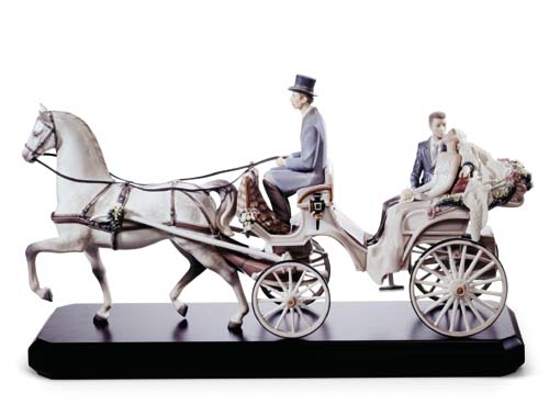 雅致(LLADRO)的華貴瓷藝是歷年來雅致作品中最具藝術表達力的一個系列。該系列中作品“新娘馬車”最令人嘆為觀止之處在于它完全不依靠其他支撐點或陶瓷底座,僅靠三條馬腿和四個輪子支撐重量。此外,這件作品對于細節的刻畫極盡精致唯美。新娘雍容華貴的婚紗上刺繡著精致的花紋、長長的裙擺間微微的褶皺、頭發后飄散的精美長披巾,以及裙擺下微露的繡花花邊均是雅致精湛瓷藝的呈現。