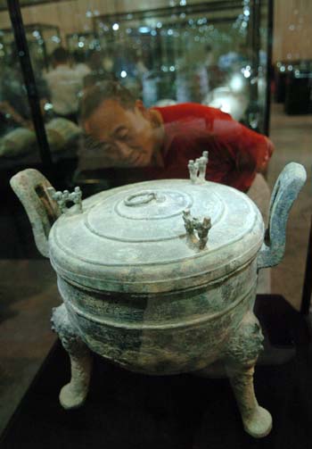 近日,150余件海外回流文物在甘肅省天水市向公眾展出,這些曾流失在美國、英國、歐洲、日本、臺灣、港澳等國家和地區的文物均為國家級文物,包括青銅器、三彩、彩繪、玉器等。圖為文物收藏愛好者在參觀海外回流文物。