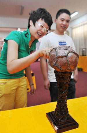 在銀川市舉辦的第八屆中國銀川賞石旅游節上,一件酷似“大力神杯”的戈壁奇石驚艷亮相。新華社記者 王鵬/攝 |