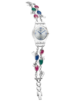 斯沃琪月光寶石·浪漫名媛淑女腕表(LadyMaona)的表鏈繼承了斯沃琪Bjioux的色彩和繁花圖案,采用拋光不銹鋼316L制造,由略呈拱形的橢圓團花構成,飾以彩色半透明合成樹脂。橢圓團花與優美的花卉吊飾從鏈條上垂掛而下,通往透明的塑料表殼。優雅的設計凸顯了腕表的精致與名媛氣質。
