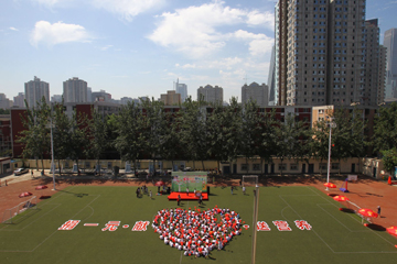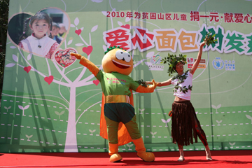 7月2日,作為前期預熱的北京愛心傳遞活動拉開帷幕。當日,北京呼家樓中心小學五年級的孩子們像過節一樣高興,他們的好朋友——“面包人”小愛來到他們身旁,把千余個精致可愛的面包造型的零錢包送到了孩子手中。而在小學操場中央,巨型大字拼成的“捐一元·獻愛心·送營養”活動主題特別引人注目,特別是“愛心”兩個字,由小學生們用一千個紅色愛心氣球組合而成;顒娱_始,氣球帶著孩子們的愛心、希望和祝福,飛上天空。