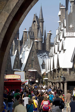 美國娛樂產業領域的經濟專家哈羅德·沃戈爾稱,環球影城的客源因經濟危機來襲后銳減,急需新的刺激點。 2009年奧蘭多環球影城的游客量較前一年下降了10%,降至550萬人;而較新的冒險島部分游客量情況更糟,下降了11%,降至460萬人。與此同時,影視城中相關的食物、飲料和其他商業產品的銷量在2007年至2009年間急劇下降了近20%。長時間沒有新的投資使得環球影城越來越無法和同樣處于奧蘭多的迪斯尼游樂園競爭。 在這樣的情況下,環球自2002年便與華納協商哈里·波特主題公園的版權事宜,希望將哈里·波特主題公園落戶于環球影城,并希望通過哈里·波特風靡全球的“魔法”,將年游客量增加至少10%。 哈里·波特系列小說自出版以來,在短短13年里,已為作者J.K