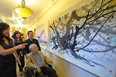 7月11日,《吳冠中大師紀念展》在美國加州奧克蘭市的美國中國藝術博物館舉行。圖為吳冠中弟子、畫家葉森(右一坐輪椅者)等欣賞吳冠中畫作《小鳥天堂》。 這一展覽共展出美國舊金山灣區華人收藏家收藏的7幅吳冠中作品。一些著名畫家和當地華人藝術家當天出席紀念展,共同緬懷吳冠中大師不平凡的藝術人生。劉藝霖攝
