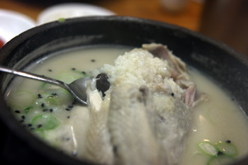 今年夏天的異常高溫,讓幾乎半個地球的人都難以忍受。該吃些什么來消暑呢?涼滋滋的雪糕?冷颼颼的冰飲?還是苦哈哈的綠豆湯?看看韓國人的另類祛暑秘方吧——熱乎乎的大補參雞湯! 參雞湯,顧名思義,就是有“人參”的“雞湯”,為韓國第一補湯。該湯制作講究,為達到嫩而不柴、香而不膩的效果,要選擇不大不小、一斤多的6周齡童子雞,將其充分洗凈后,在腹內塞滿韓國高麗人參、黃芪、當歸、枸杞、大棗、板栗、大蒜、糯米等數十種藥材,經過數小時的精心燉制,湯汁變白變濃,出鍋時撒上香噴噴的蔥花、芝麻即成。一道雞湯,既有湯又有肉還有飯,清淡鮮美,滋補營養,堪稱高效。 這道湯里最重要的部分——人參,在中國醫藥里,一般只適合于產后、術后氣血大虛之人?墒窃陧n國,人參是男女老少健病皆宜的食材,備受推崇,因此各種人參制品,如人參糖、人參糕點、人參茶、人參湯、人參酒、人參蜜等隨處可見。經濟能力許可的老人還會每隔一段時間拿切成片的新鮮人參蘸著蜂蜜直接入口吃。盡管如此,大夏天的,將如此大補之物入口,還是令人詫異?身n國人卻認為,正因為是夏天,人體因出汗多而消耗能量、營養,吃了參雞湯,體內積聚的廢物隨汗水排出,而讓人參雞這樣滋補的東西墊底,才有益身體健康。因此,每年入伏之后“參雞湯”就是韓國人必吃之補品。 據行家介紹,參雞湯所使用的是未經加工的新鮮人參,俗稱水參,能起到“涼補”的作用。同時,富含蛋白質的雞肉有溫中益氣、補精添髓、補虛益智的作用。紅棗富含維生素,板栗富含氨基酸,能補腎補氣,糯米性味甘溫、入脾腎肺經,可益氣健脾、生津止汗。這些性質溫和的輔料搭配在一起,經過完美熬煮,融為一體,具有大補元氣、固脫生津之功效、適用于勞傷虛損、食少、倦怠、健忘、眩暈頭痛、陽痿、尿頻、氣血津液不足等癥,正好可以滿足夏季進補的需要。 在韓國街頭,有不少參雞湯專營店,而位于首爾景福宮附近的“土俗村”是最有名的。這里一年四季都人滿為患,如今天已入伏,每天門口都排著長龍,不等上半個小時別想吃上令人心心念念的參雞湯。 近日,記者也懷著好奇之心,耐心等候了足足半個小時,終于嘗到了這美味的大補湯。 一坐下,店家先送上一杯人參酒。這人參酒雖然只有一小杯(四錢左右),可是濃厚的參味讓人不得不慢慢品、慢慢抿。隨后,裝在瓦罐里的參雞湯上桌了。只見奶白色濃濃的雞湯里漂浮著點點的瓜子、芝麻和蔥花,整只小小的童子雞肉泛著淡淡的粉色,一看就引人食欲。 小心地下筷,夾起一些雞肉,長時間的燉煮早已將雞肉煮得酥爛無比,且充滿了藥材的清香。平素因嫌雞肉肉質干硬而不愛吃的記者也吃得津津有味。掀開雞肚子,里面軟軟的糯米因浸透了雞湯,變得微黃,仿佛沾滿了鮮香的雞油,放進嘴里入口即化。雞肚子里,還有小半根早已軟爛的山參。一口吃下,感覺自己一下子精力倍增。而最精華的部分,當然就是那濃湯了。經過幾個小時的燉煮,雞肉、人參、紅棗等的營養早已融入其中,加上該店獨特的秘方湯料,清淡的鮮美無與倫比,雞肉的鮮香、紅棗的甜香、人參的清香……和諧交融,簡直難以言說。 |