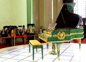 這架鋼琴被主辦方放置在展覽中心一層中央大廳的正中間位置。琴身主體材料為孔雀石,并用大量黃金、珠寶作裝飾,整琴重達639公斤,極為奢華。這架鋼琴有130多年的歷史,原為俄國皇室所有,后輾轉被多名世界樂壇名流收藏,其中就包括邁克爾·杰克遜。