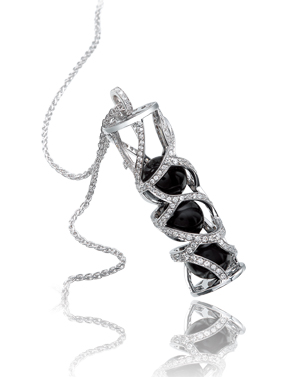 世界領先珠寶和腕表品牌DorisVinci(桃麗芬奇)日前展示了全新Rain雨系列。該系列靈感來源于大自然中的雨滴。設計師捕捉到了接踵而下的甘露,將這些轉瞬即逝的精靈攏入鉆石制成的銀瓶,懸于胸前細細賞玩。21.52克18K白金項鏈,搭配3顆總重4.2克的黑瑪瑙,裝飾211顆圓型切割鉆石,韻味十足。