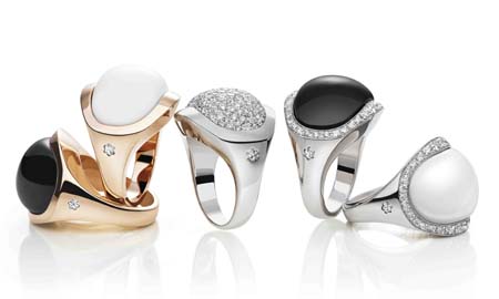 萬寶龍品牌繼白雪美人之EtoiledeMontblanc鉆飾珠寶系列的三款18K金戒指后,又于近期推出了兩款新品,均為白金鉆石戒指。兩款最新設計采用白金材質綴以黑色縞瑪瑙或白瑪瑙,用鉆石搭配,在設計和外觀上令人眼前一亮?傊亓窟_0.8克拉的裝飾鉆石由不同大小的圓形明亮鉆石構成。該系列戒指環上更鑲嵌有獨一無二的萬寶龍星形美鉆。