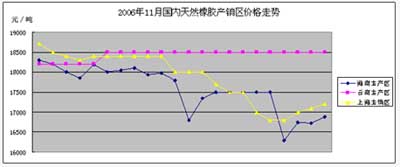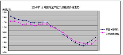 市場動態:根據農業部農墾局監測,2006年11份國外泰國三號煙片膠和印尼20號標準膠價格大幅回落,而國內期貨、現貨價格也隨之節節下滑,成交量日漸萎縮,主產區云南全月幾乎沒有成交。 國外主產區:泰國RSS3十一月平均價格為1659.5美元/噸,比上月下跌212.6美元/噸,最高價為1797.6美元/噸,最低價為1499美元/噸;印尼SIR20標準膠十一月平均價格為1646.8美元/噸,比上月平均價下跌207美元/噸,最高價為1745美元/噸,最低價為1517.5美元/噸;新加坡期貨市場的到期現貨月平均價格為1626美元/噸,最高價為1745美元/噸,最低價為1500美元/噸。