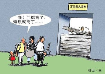在傳統戶籍制度逐漸松動,全國許多大中城市紛紛降低外來人口進入“門檻”,并給予外來人口“市民待遇”的今天,形形色色的“人口準入制度”無異于與時代潮流唱反調,外來人口“素質論”顯然是建設和諧社會過程中的不和諧音符。什么時候我們不再拿外來人口的素質說事兒,就無疑表明城里人的文明素質、地方政府的執政素質大大向上提升了一步。