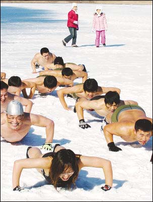1月14日,冬泳愛好者在韓國首都首爾附近的雪地里熱身,準備參加潛水比賽。當日,選手們冒著零下9攝氏度的嚴寒,在首爾附近的漢江參加一年一度的冬季潛水比賽。