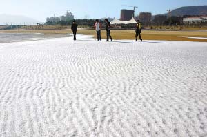 2月1日,江蘇連云港市最低氣溫達到零下五攝氏度,連云港沿海一些沙灘上,夜間退潮時的海水泡沫結成了白茫茫的冰凌,給寒冬里的連云港海濱增添了一道風景。