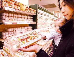 在日本東京,首批“廣告雞蛋”2月1日起在日本大榮超市連鎖店銷售,這批雞蛋的蛋殼上有日清食品公司的“雞湯拉面”廣告。圖為一名消費者觀看有廣告的雞蛋。