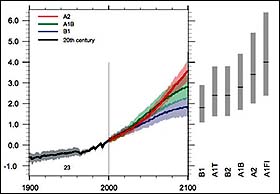 《氣候變化2007:科學基礎》中的氣溫上升示意圖。A1為高經濟發展情景,人口得到控制。此情景包括:大量使用化石燃料(A1FI)、不使用化石燃料(A1T)、能源種類平衡發展(A1B)。A2是低經濟增長情景,人口持續增長。B1假定各國對環境保