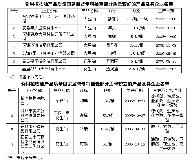 為了維護消費者的合法權益,進一步促進食用植物油行業的健康發展,切實從源頭加強食用植物油質量安全的監督管理,春節前夕,國家質檢總局組織對部分“年貨”食品進行了國家監督專項抽查。其中,食用植物油產品共抽查了北京、天津、河北、湖南、上海、江蘇、安徽、廣東、廣西、河南、山東等11個省、直轄市127家企業生產的140種產品,產品抽樣合格率為93.6%。自2002年開始實施食用植物油市場準入制度以來,國家質檢總局加強了對食用植物油加工企業的監管,食用植物油的產品質量比2002年提高了14.4個百分點。