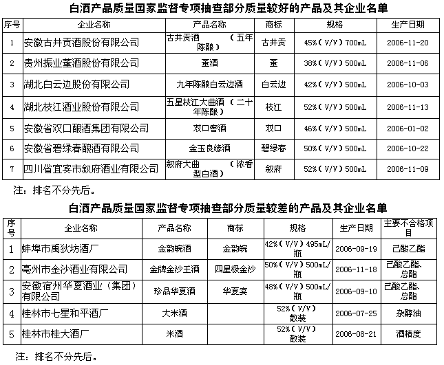 抽查結果表明:通過連續的國家監督抽查,提升了企業質量意識,使白酒產品質量整體水平有所提高,大中型企業的產品質量持續保持穩定。
