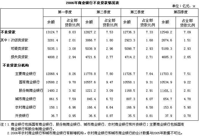 日前,中國銀行業監督管理委員會發布了2006年商業銀行不良貸款情況表。詳情如下: