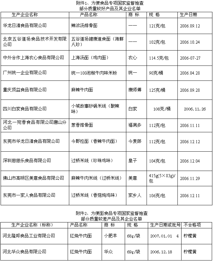 3月1日,國家質檢總局發布了對方便面、方便米粉、方便米線等方便食品進行的專項國家監督抽查結果。此次共抽查了北京、河北、上海、江蘇、福建、江西、山東、河南、廣東、重慶、四川、貴州等12個省、直轄市45家生產企業的63種產品,經檢驗合格61種,抽樣合格率為96.8%。