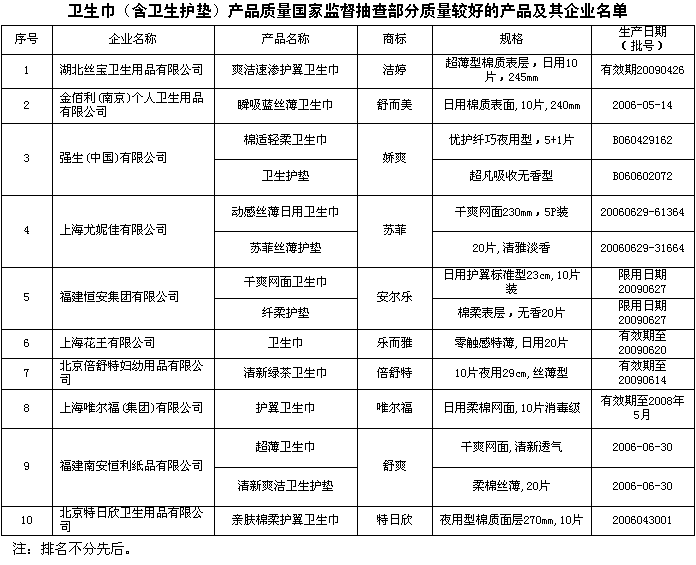 為了維護廣大消費者的合法權益,促進衛生巾行業健康發展,國家質檢總局組織對衛生巾(含衛生護墊)產品質量進行了國家監督抽查。共抽查了北京、天津、河北、江蘇、湖北、廣東、浙江、上海、福建等9個省市59家企業生產的73種產品,產品抽樣合格率為78.1%。