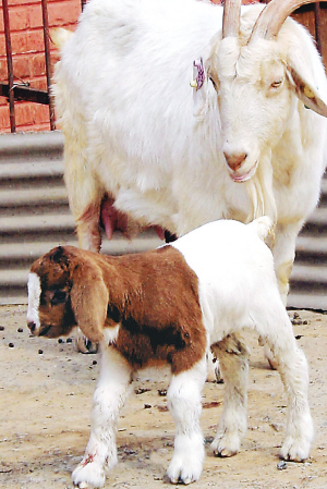 。丛拢谷,中國首例、世界第二例體細胞克隆波爾山羊在天津市畜牧獸醫研究所順利降生。圖為母山羊和剛降生的小羊羔在一起。