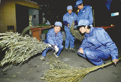 4月16日,師傅教給新上崗的耿佳明(前右)的第一課是“扎掃帚”。當日凌晨,上海市盧灣區市容管理局新錄用的26名大中專生和技校生清道工正式上崗。這批新錄用的員工中有6名是大專生。