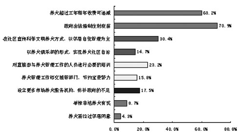 綜上所述,居民不愿意給寵物犬登記,相當一部分原因是出于對目前管理制度有些看法。調查發現,居民贊同的寵物犬管理辦法中,免費強制注射疫苗、養犬超過3年且每年收費遞減,是提及率最高的兩個,分別為70.9%和60.2%。這再一次強調了居民“降低收費、獲得服務”的愿望。 值得注意的是,居民對養犬自治(鄰居自覺管理、養犬俱樂部)、政府管理優化(工作人員培訓、管理工作移交城管)都表現出了較大的熱情,同時他們還希望通過市場機制獲得更好的養犬服務。 寵物犬管理是城市管理工作中的一個難點,各個城市和國家均要根據自己的情況出臺各有特色的管理辦法。在狗身上植入“電子身份證”是目前寵物犬管理中的一項先進管理技術,但不論技術多先進,最首要的事還是促使居民能夠主動為寵物上戶口,只有將寵物犬納入規范管理軌道,其他相應的管理措施才能成行。因此,如何提高養犬居民的注冊意識,才是各城市制定和調整養犬政策時應當首先考慮的。 寵物犬上戶口后期望應享的權益和服務