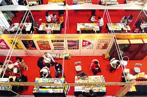 。丛拢玻等,主題為“倡導全民閱讀,建設和諧文化”的第十七屆全國書市(全國圖書交易博覽會)在重慶國際會展中心開幕。本屆書市展位1444個,共有1600多家單位出版的21.5萬種圖書和4.5萬種電子音像制品參展。圖為書市展廳一角。