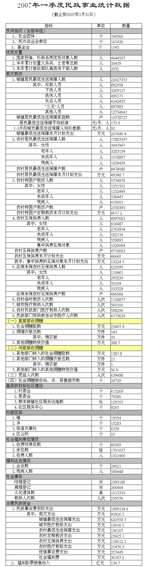 上公布了2007年第一季度民政事業統計數據。詳情如下:
