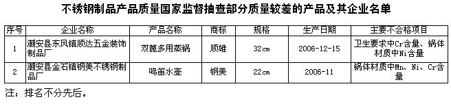 2、個別產品不銹鋼材質不合格。國家行業標準QB/T1622.7-1992《不銹鋼器皿壺》規定,不銹鋼器皿要求制造使用的材質為1Cr18Ni9、0Cr19Ni9牌號的不銹鋼板材或使用性能不低于上述規定的其它牌號。標準中規定的板材適用于接觸食品的餐具及烹調制品。抽查中有個別產品未按標準選用適宜的不銹鋼材質。