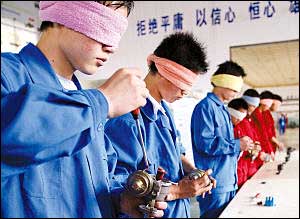 5月11日,幾名汽修專業應屆畢業生展示蒙眼拆裝分電器技能。當日,山東建設學院舉行首屆高級技工畢業生雙向選擇洽談會,500多名數控機床、汽修等專業應屆畢業生與用人單位簽訂協議。