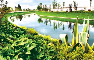 云南省昆明市官渡區對進入滇池的26條河道進行整治,目前已有100公里河道實現河底無淤泥、河面無漂浮物、河岸披綠。圖為整治后的枧槽河。