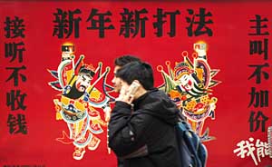 2007年2月7日,兩位行人從位于北京復興門附近的廣告牌前走過。從當月8日起,北京移動推出全球通“暢聽99”的業務套餐,加入該套餐業務的手機用戶可以享受到被叫完全免費的服務。本報記者