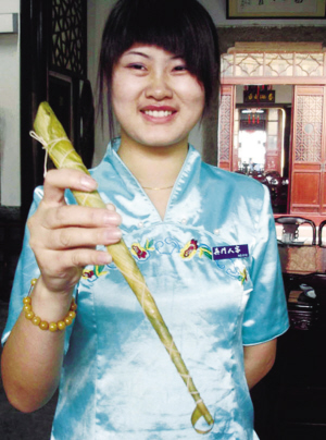 蘇州商家推出多種造型新穎的粽子,吸引消費者的目光。圖為銷售人員展示一種筆造型的粽子。 | 南京:紅酒燕窩上陣 八只粽子作陪