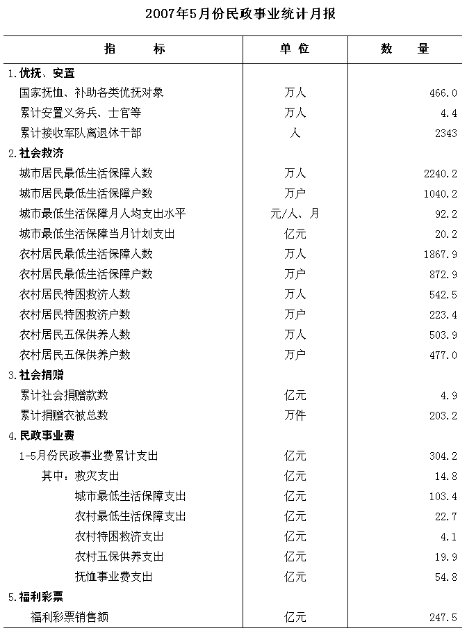 本網訊 日前,民政部在其網站上公布了2007年5月份民政事業統計月報。鄉情如下: