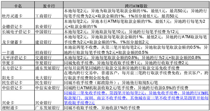 2500元,只要花4次取款,而異地跨行ATM機取款每筆手續費為12元,那么手續費為12×4=48元,節省了22元。 5月央行提高ATM機日提款上限到2萬元本來是為減少排隊、方便取款,持卡人在實際操作中卻發現,如果是本地跨行取款2萬元要付出20元的手續費。其實不同的銀行,ATM機取款額度有所不同。用銀行卡在ATM機上取款時,無論哪家銀行當日累計的取款金額是5000元還是2萬元,但每次單筆最多能取的額度也是不一樣的。 在北京工作的李女士是建行龍卡借記卡的持卡人。李女士在中國銀行的ATM機上取款時卻發現,每次最多只能取2000元,取滿2萬元不僅需要反復操作10次,還要付出高達20元的手續費。李女士認為,銀行應將單筆提款的額度提高,這樣可以少取幾次,總的手續費就可以降下來。李女士的看法代表了相當一部分持卡人的聲音。 但目前跨行取款大多數銀行都是要收取手續費的,取款人要想省下跨行的手續費,只能選擇每筆較高額度的ATM機,減少跨行的手續費用。特別是當需要一次取出大量現金,又有不同銀行的兩至三個ATM機可以選擇時,應該遵循以下兩個原則:一、要選發卡行的ATM機;二、如果沒有發卡行的ATM機,要選擇單筆取款金額比較多的銀行。 一般銀行都沒有對跨行取款的單筆限額單獨設限。本行的ATM機對本行卡與他行卡一視同仁,但當他行卡的單筆取現額度低于本行卡時,以他行卡的限額為準。以工商銀行為例,其ATM取款機單筆取現的最高額度是3000元。但建設銀行的銀行卡單筆取現額度是2000元,當它在工商銀行ATM取款機上取款時,每次最多只能取2000元。 此外,如果手中持有的銀行卡是浦發銀行、光大銀行、民生銀行和華夏銀行等銀行發售的,跨行取款有一定的優惠,它們有的同城跨行不收取手續費或者異地跨行取款有2至3次的免手續費機會,相對于其他銀行卡在ATM機取款,可節約一定的手續費。(見下表)