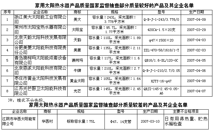 家用太陽熱水器是由太陽集熱器、貯熱水箱、管道及控制器等組成的節能產品,產品類型主要分為真空管型、平板型和悶曬型。據統計,2006年全國已有家用太陽熱水器生產企業五千多家,總產量達到2000萬平方米。 為維護消費者的合法權益,促進家用太陽熱水器行業健康發展,國家質檢總局組織對家用太陽熱水器產品質量進行了國家監督抽查。共抽查了北京、河北、江蘇、浙江、安徽、山東、湖北、廣東等8個省、直轄市40家企業生產的40種產品(不涉及出口),產品抽樣合格率為82.5%。 此次抽查依據強制性國家標準GB4706.1-1998《家用和類似用途電器的安全第一部分