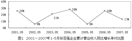 1-5月份,百強企業累計完成營業收入4473.0億元,同比增長13%(見圖1)。