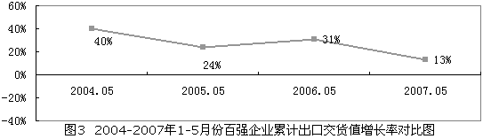 1-5月份,百強企業累計完成出口交貨值1214.3億元,同比增長13%,增速有所放緩(見圖3)。