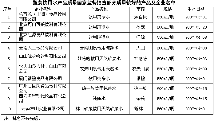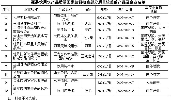 瓶裝飲用水包括飲用天然礦泉水、飲用純凈水和飲用水等。為維護消費者的合法權益,促進瓶裝飲用水行業健康發展,國家質檢總局組織對瓶裝飲用水產品質量進行了國家監督抽查,共抽查了北京、河北、山西、黑龍江、吉林、遼寧、上海、江蘇、浙江、河南、湖南、湖北、廣東、陜西、福建、江西、四川、云南、甘肅、貴州等20個省、直轄市145家企業生產的148種產品(不涉及出口),產品實物質量合格率為87.2%。其中,抽查了101種飲用純凈水、32種飲用天然礦泉水、15種飲用水。 此次抽查依據強制性國家標準GB7718-2004《預包裝食品標簽通則》、GB17323-1998《瓶裝飲用純凈水》、GB17324-2003《瓶(桶)裝飲用純凈水衛生標準》、GB19298-2003《瓶(桶)裝飲用水衛生標準》及GB8537-1995《飲用天然礦泉水》規定的要求,對瓶裝飲用純凈水產品進行了色度、混濁度、臭和味、肉眼可見物、電導率、高錳酸鉀消耗量、亞硝酸鹽、鉛、總砷、銅、游離氯、菌落總數、大腸菌群、霉菌和酵母、致病菌及標簽等16個項目的檢驗;對飲用水產品進行了色度、混濁度、臭和味、肉眼可見物、亞硝酸鹽、耗氧量、鉛、總砷、銅、鎘、余氯、菌落總數、大腸菌群、霉菌、酵母、致病菌及標簽等17個項目的檢驗;對飲用天然礦泉水產品進行了臭和味、肉眼可見物、色度、渾濁度、鋰、鍶、鋅、溴化物、碘化物、偏硅酸、硒、溶解性總固體、鉛、汞、砷、氟化物、耗氧量、亞硝酸鹽、菌落總數、大腸菌群及標簽等21個項目的檢驗。 抽查結果表明,市場占有率較高的大型生產企業產品抽樣合格率為95.7%,產品質量較好;而部分中小型生產企業產品質量存在一些問題。 抽查中發現的主要質量問題: 1、部分產品菌落總數、大腸菌群超標。菌落總數、大腸菌群是反映飲用水衛生質量狀況的重要指標。菌落總數、大腸菌群的高低,表明飲用水受污染的程度。強制性國家標準GB17324-2003《瓶裝飲用純凈水衛生標準》規定,飲用純凈水的菌落總數應≤20cfu/ml,大腸菌群≤3MPN/100ml;強制性國家標準GB19298-2003《瓶(桶)裝飲用水衛生標準》規定,飲用水的菌落總數應≤50