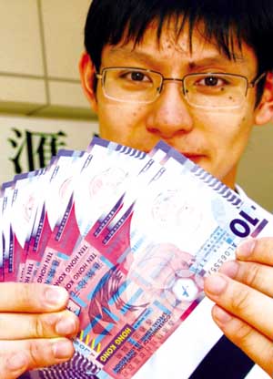 香港首批10港元面額的塑質鈔票9日面世,發行量為5000萬張。這款新鈔比舊鈔更耐用、更易保持干凈,而且符合環保要求。 圖為香港市民在匯豐銀行前,展示剛兌換的新10元塑質鈔票。