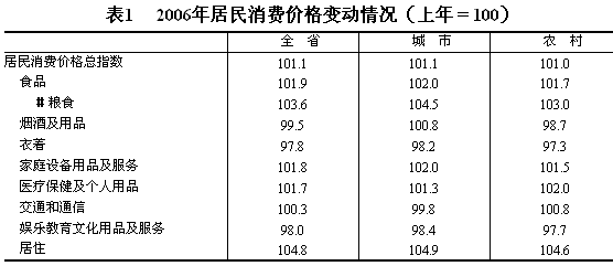 全省居民消費價格上漲1.1%(見表1)。其中居住類上漲4.8%,食品類上漲1.9%,商品零售價格上漲0.8%,農業生產資料價格下降0.4%,工業品出廠價格上漲3.8%,原材料、燃料、動力購進價格上漲5.6%,固定資產投資價格上漲1.5%。房屋銷售價格上漲2.5%。
