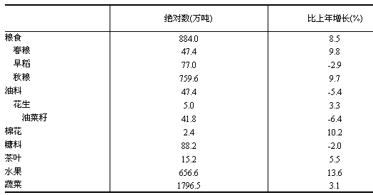 全年農作物總播種面積2848.4千公頃,與上年基本持平。全年糧食播種面積和單產分別比上年增長0.9%和7.5%,單產創歷史新高,糧食總產量為884.0萬噸(見表2),增長8.5%,其中晚稻總產量629.6萬噸,增長11.3%。