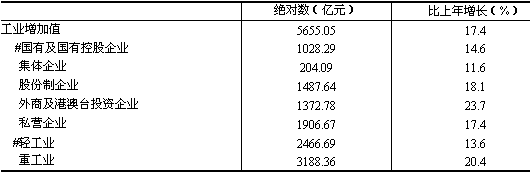 2006年,全部工業增加值為7538億元,比上年增長14.4%,其中規模以上工業增加值5655億元,增長17.4%,輕、重工業增加值分別增長13.6%和20.4%(見表3)。規模以上工業銷售產值27856億元,增長24.5%。國有及國有控股工業企業增加值1028億元,比上年增長14.6