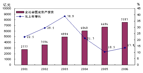 2006年,全社會固定資產投資7593億元,比上年同口徑增長13.8%(見圖2),其中限額以上投資
